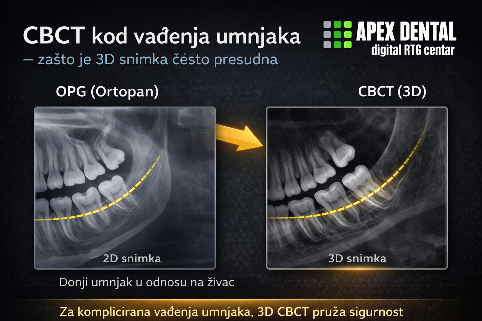 CBCT umnjaci danas predstavljaju standardnu dijagnostičku metodu u rizičnim slučajevima vađenja umnjaka. Vađenje umnjaka jedan je od najčešćih oralno-kirurških zahvata, ali istovremeno i jedan od